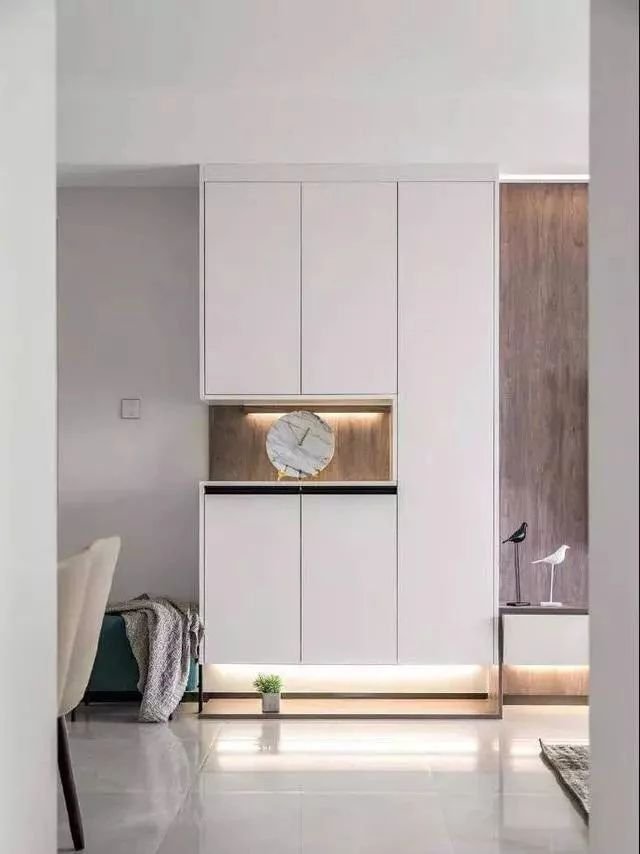入戶定制到頂鞋柜,避免空間浪費增加收納。鞋柜設計上也考慮很周到,中間空余部分和底部都裝有照明燈。白色極簡無拉手柜門,實用又高級。
