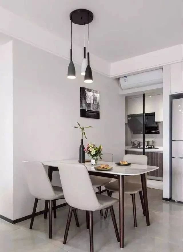 餐廳實用為主,摒棄繁雜的裝飾品,簡單漂亮。冰箱以嵌入的方式擺放在角落,避免影響其他空間,空調內機半隱藏式,整體美觀協調。