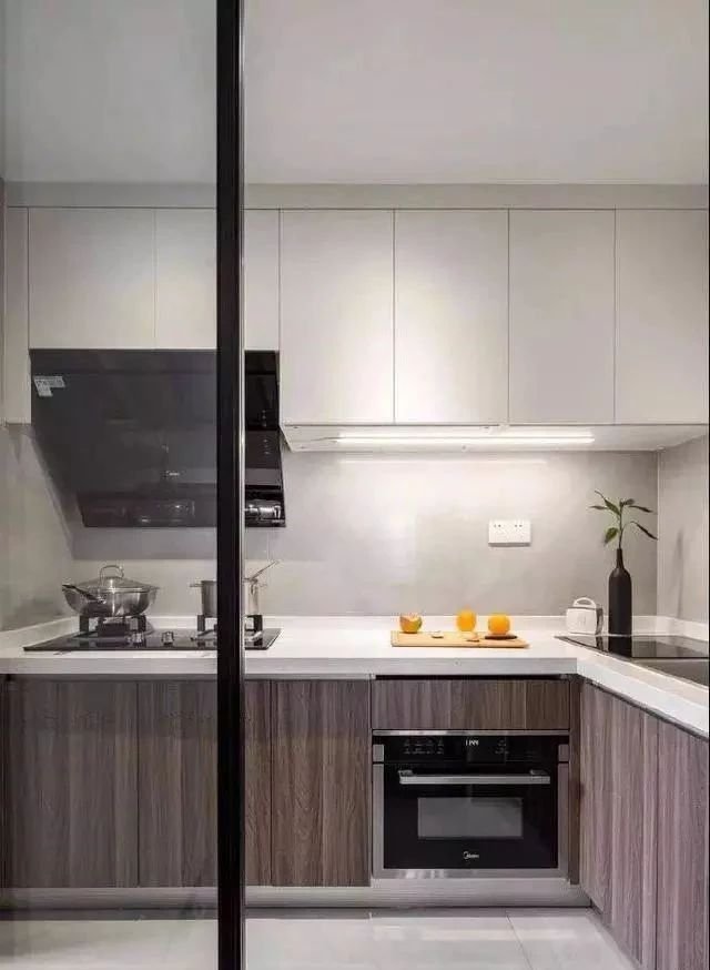 L型廚房設計,定制櫥柜和吊柜,深淺色搭配提升空間層次感。黑色全框玻璃門,增加了通透感,避免空間過于封閉。