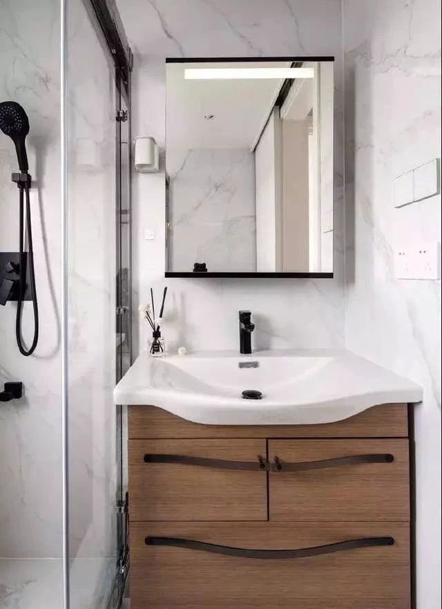 衛生間緊湊實用,定制浴室柜滿足尺寸需求,灰白色瓷磚避免空間過于壓抑。