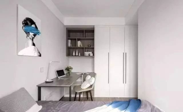 次臥兼書房,衣柜與書桌吊柜完美銜接,簡潔實用的設計,讓原本緊湊的空間不那么擁擠。