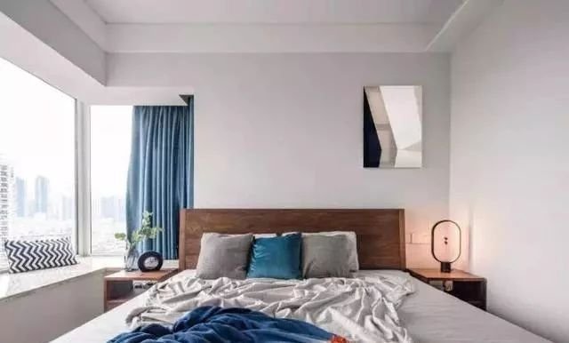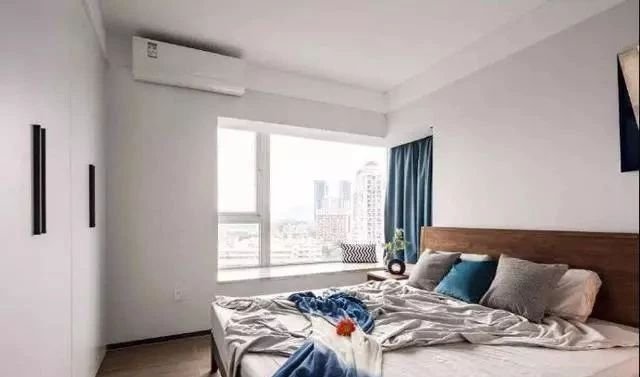 主臥簡潔明亮,轉角飄窗極大的提升了臥室采光,窗簾設計避免過長,視覺效果非常好。床尾設計衣柜,一整排收納空間夠用了。