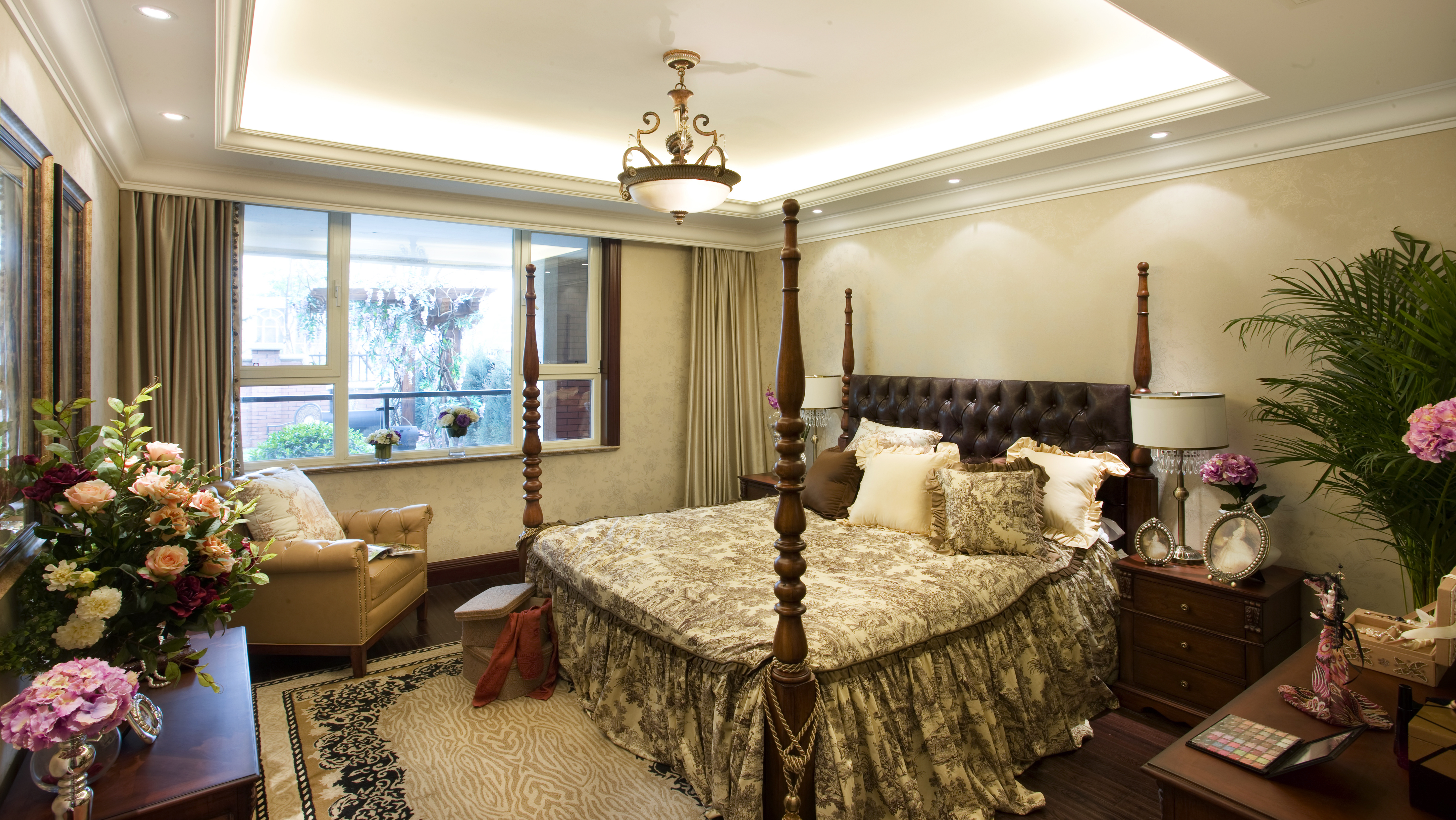 臥室的風格與情調主要不是由墻、地、頂等硬裝修來決定的,而是由窗簾、床罩、衣櫥等軟裝飾決定的,它們面積很大,它們的圖案、色彩往往主宰了臥室的格調,成為臥室的主旋律。