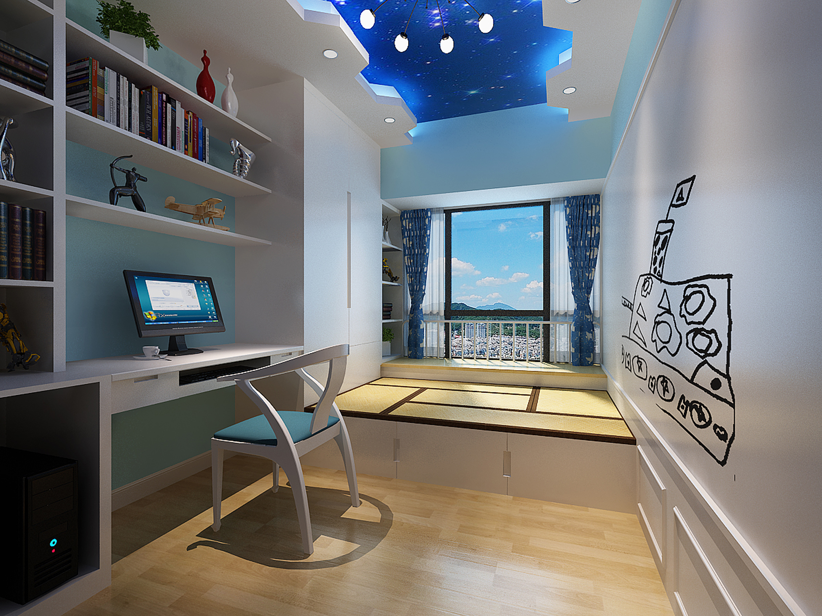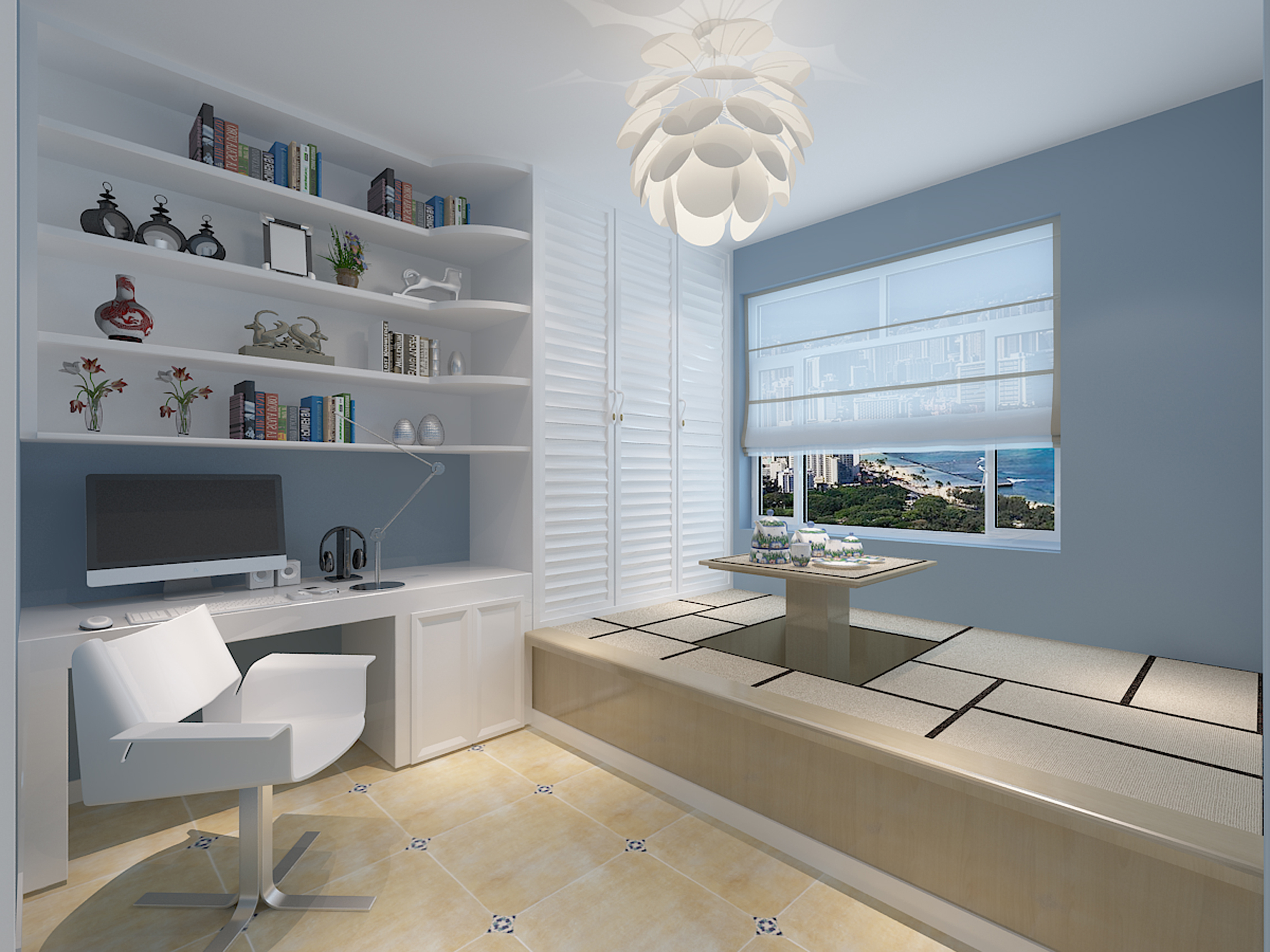 喜歡自由、無拘無束的生活,可以將陽臺榻榻米設計成田園風,用深藍底布搭配,與天空藍相似,讓人感覺是在天空中翱翔一樣,非常舒適,又充滿田園氣息。同時在榻榻米下方設計了幾個柜子,大大加強了空間的儲物能力,在榻榻米的上方還擺放著幾個抱枕,在上面休息乘涼也是相當舒適的。