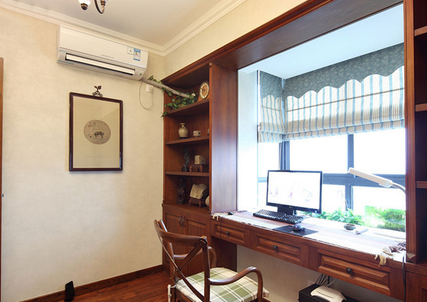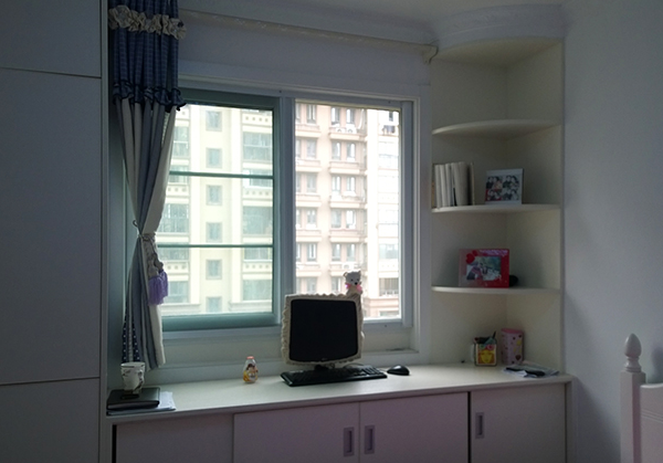 古香古色的書(shū)柜與飄窗完美結(jié)合,形成余地甚多的書(shū)桌,書(shū)桌下面還有空間,不會(huì)拘著雙腿的活動(dòng),而且外面的窗臺(tái)上還可以種點(diǎn)小花。