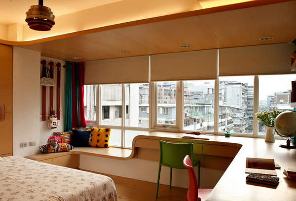帶著轉(zhuǎn)角的書(shū)桌將范圍一下子擴(kuò)大了不少,同時(shí)高度之間的落差又考慮到了不同高度飄窗的作用,高一點(diǎn)的可以在上面做作業(yè)等等,低一點(diǎn)的可以直接坐在上面,抱著抱枕說(shuō)說(shuō)話是最好不過(guò)的了。